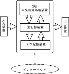 コンピュータは、(記憶されている)プログラムの指示にしたがって、入力されたデータを記憶し、記憶したデータについて演算を行い、求める結果を出力する。また、これら一連の処理が正しく行われるように制御する。