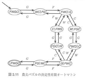遷移:農夫が小舟で運ぶもの $W, G, C$。なければ $F$