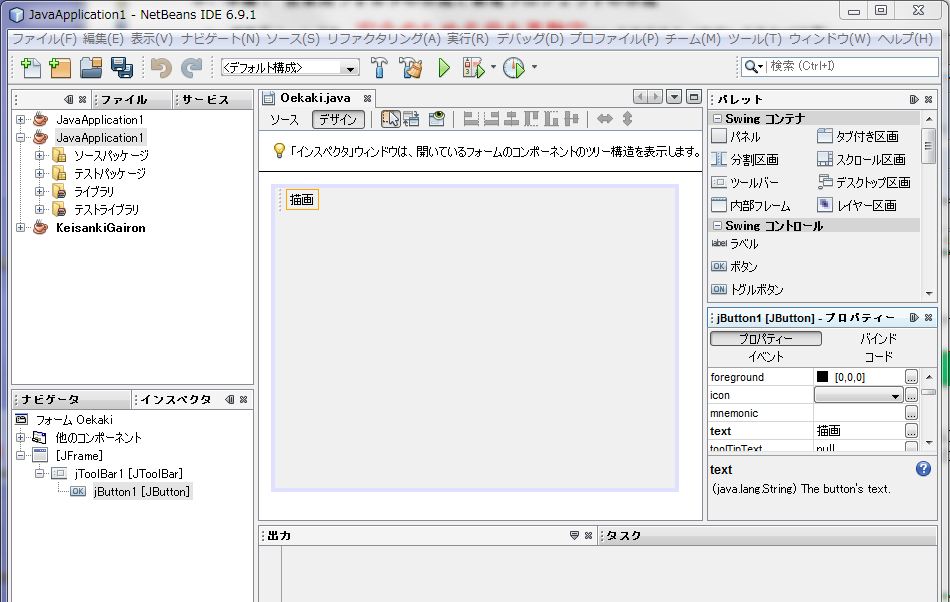 - オブジェクトjButton1をクリックせよ(ナビゲータ上で反転表示されることを確認せよ)。