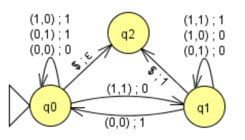 例.右図は2進和を(1桁目から)順に計算するミーリ機械で、$q_0\ (q_1)$ は繰上りが$0\ (1)$ の状態を表し、$a_n\cdots a_2a_1+b_n\cdots b_2b_1=c_{n+1}c_n\cdots c_2c_1$のとき、入力$(a_1,b_1)(a_2,b_2)\cdots(a_n,b_n)\$$に対し$c_1c_2\cdots c_nc_{n+1}$を出力する。