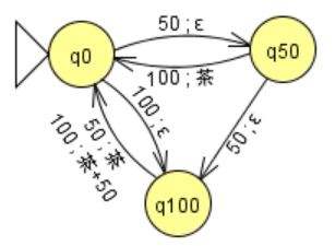 例.右図は、50円玉と100円玉のみを受け付ける150円のお茶(1種類)の簡単な自動販売機を表すミーリ機械である。状態名の$q$に続く数値はそれまでに投入された金額を表し、出力はお茶とおつりである。