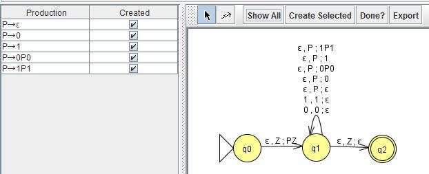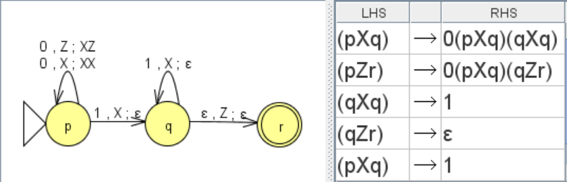 上記の構成は無駄な(終端記号列の生成に関わらない)非終端記号や規則を多量に作り出すが、図のCFGはそれらを除いてスリムにしている。図の、$0^n1^n$を受理するPDAの受理動作列の例と右のCFGの対応する導出例は以下のようになる。