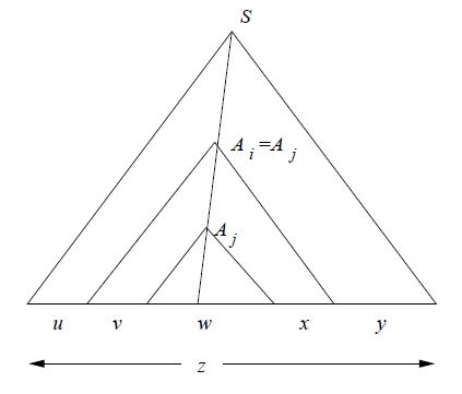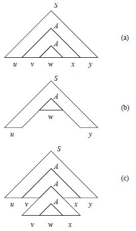 $S{\overset{*}\Rightarrow}\vect{u}A\vect{y}{\overset{*}\Rightarrow}\vect{u}\vect{v}A\vect{x}\vect{y}{\overset{*}\Rightarrow}\vect{u}\vect{v}\vect{w}\vect{x}\vect{y} \wedge \vect{v}\vect{x}{\ne}\varepsilon$と書け、$\forall k\in\mathbb{N}\ \vect{u}\vect{v}^k\vect{w}\vect{x}^k\vect{y}\in L$