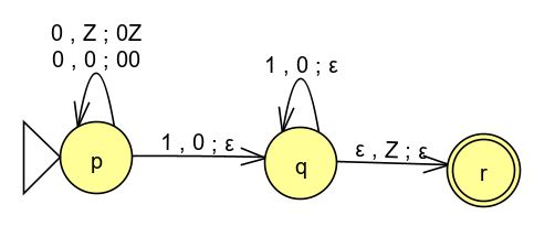 パズル.$0^n1^n$を受理するPDAを示せ。