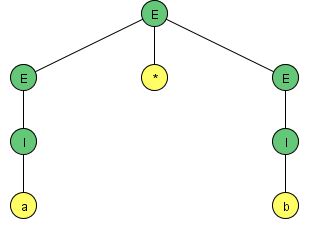 $\left\{\begin{eqnarray}E&\Rightarrow&E*E&\Rightarrow&I*E&\Rightarrow&a*E&\Rightarrow&a*I&\Rightarrow&a*b (\color{blue}{最左導出})\\E&\Rightarrow&E*E&\Rightarrow&E*I&\Rightarrow&E*b&\Rightarrow&I*b&\Rightarrow&a*b (\color{blue}{最右導出})\end{eqnarray}\right.$