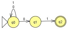 例.右図は$01$で終わる$0,1$の列を認識する非決定性有限オートマトンであり、状態$q_0$で$0$を読んだ時、状態$q_0,\ q_1$のどちらにも遷移できる。このオートマトンで、入力列を正しく認識する動作列は、文字$0$に対し、それが後ろから$2$番目の文字(状態$q_1$に遷移する)か否(状態$q_0$に遷移する)かを、(最後まで読まずに)適切に判断できた動作列である。
