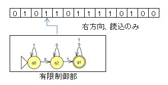 のように動作し、テープを読み終わって停止したときに状態が◎で示された受理状態($\dcircled{q_1}$)であれば、テープ上の文字列を受理(認識)する。