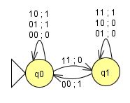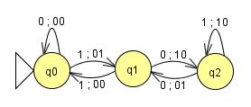 Mealy オートマトン という。 形式的には、Mealy オートマトンは $A=(S,\Sigma,\Gamma,s_0,\delta,\gamma)$ で、